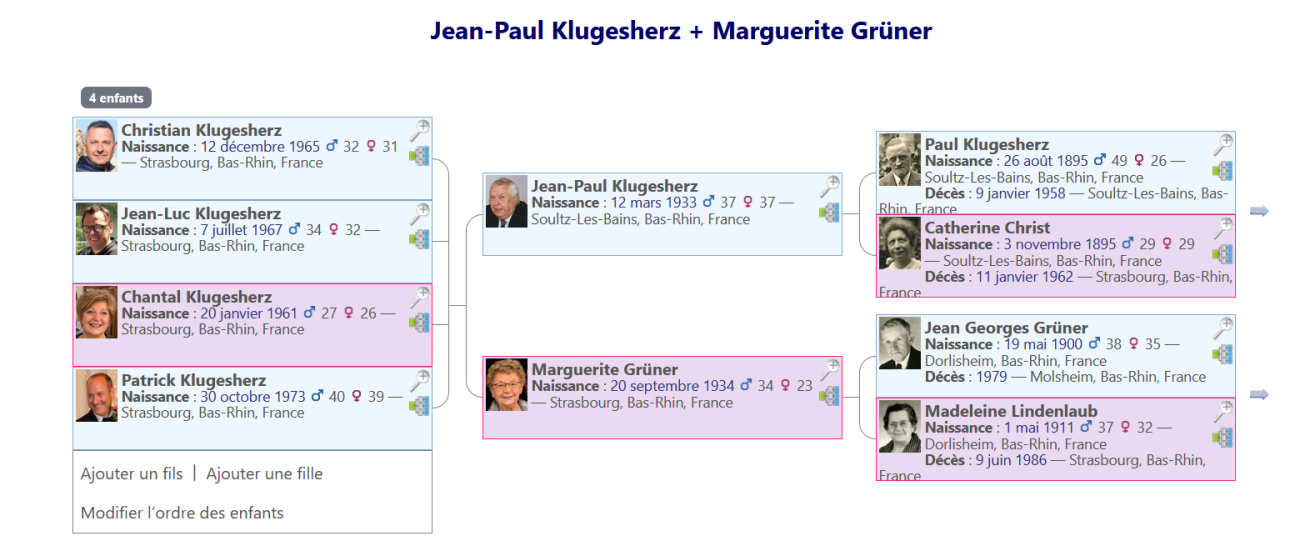 | Exemple | Joseph Klugesherz – Note: Prénom renseigné sur l'acte de naissance de Paul Klugesherz 26/08/1895François Joseph Klugesherz – Note: Prénom renseigné sur l'acte de NaissanceFranz Joseph Klugesherz – Note: Prénom renseigné sur l'acte de Mariage avec: Victoire FischerAnne Marie Oberhaußer – Note: Nom renseigné sur l'acte de naissance |